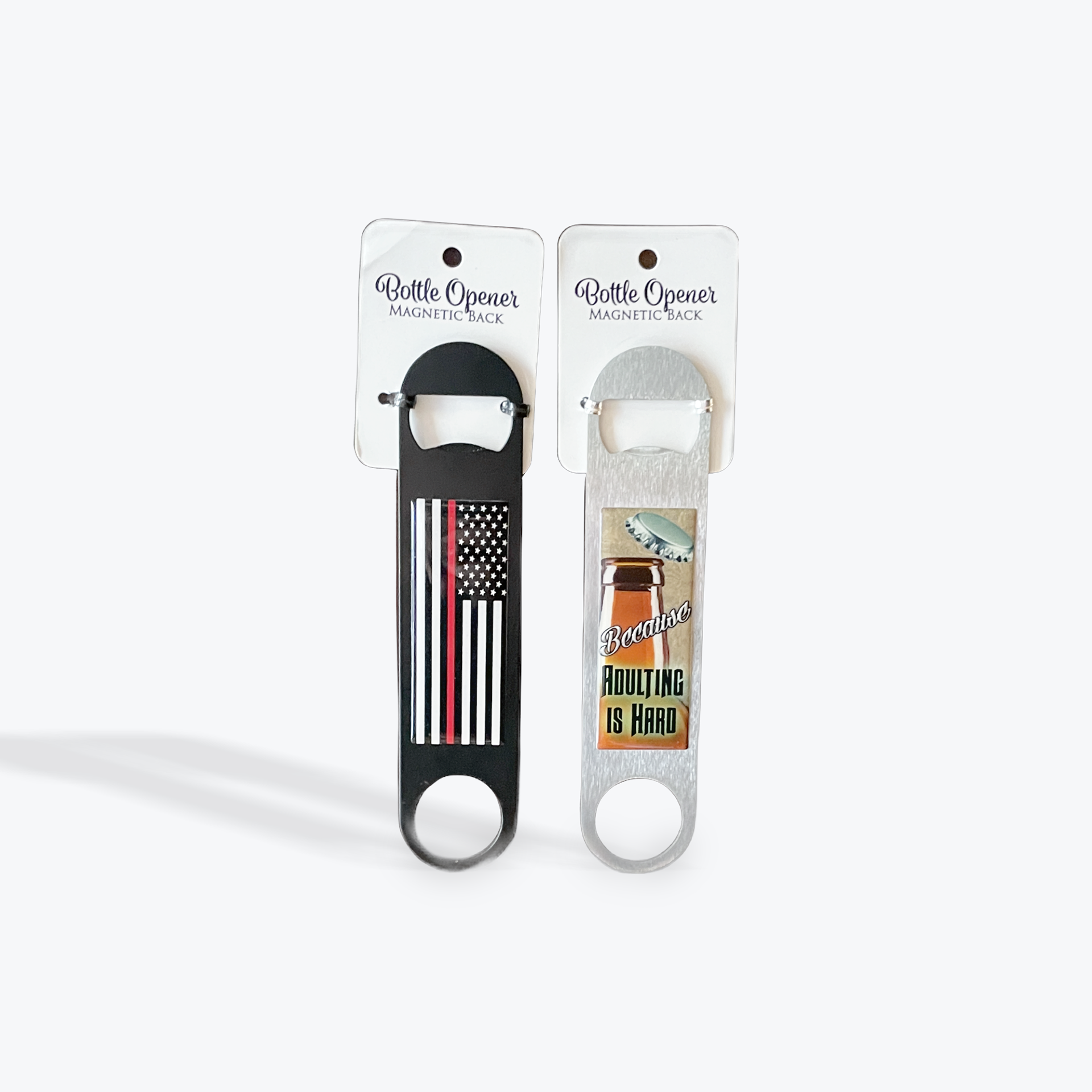 We carry a variety of bottle openers with magnetic backs that are easy to use and include great designs.