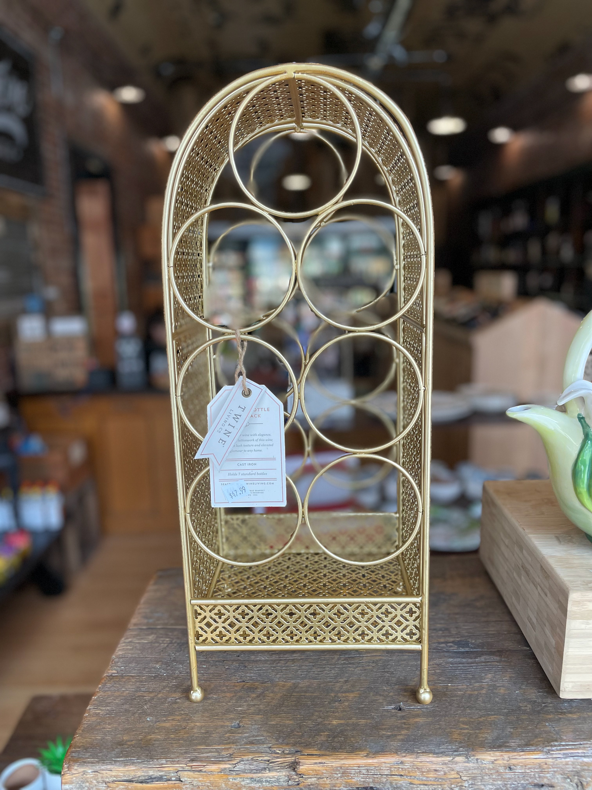 Holds up to 7 bottles of wine and made of cast iron.